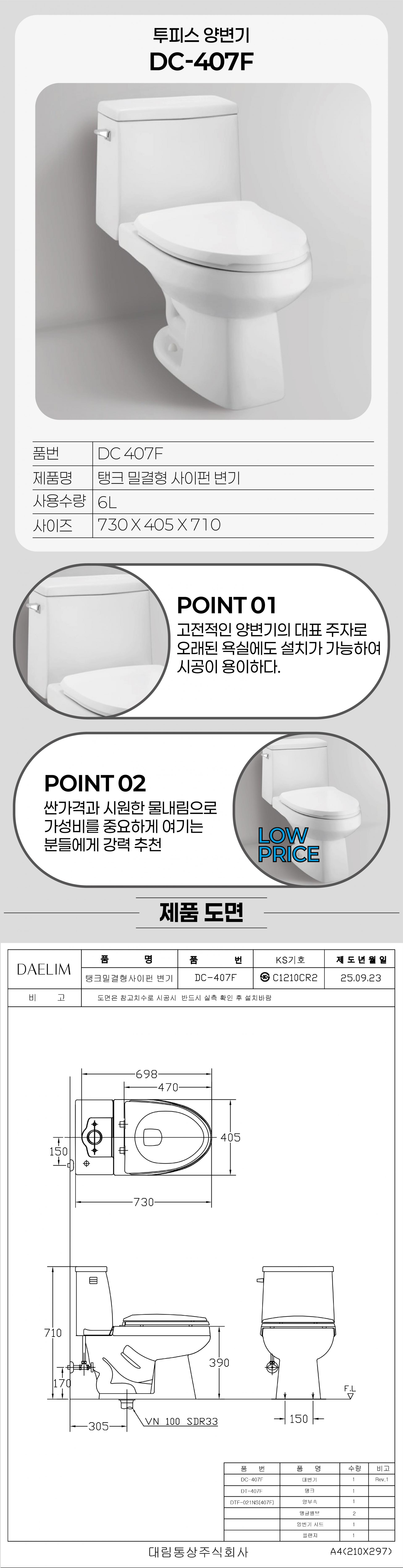 [DAELIM] DC-407F 투피스 양변기 (부속별도)
