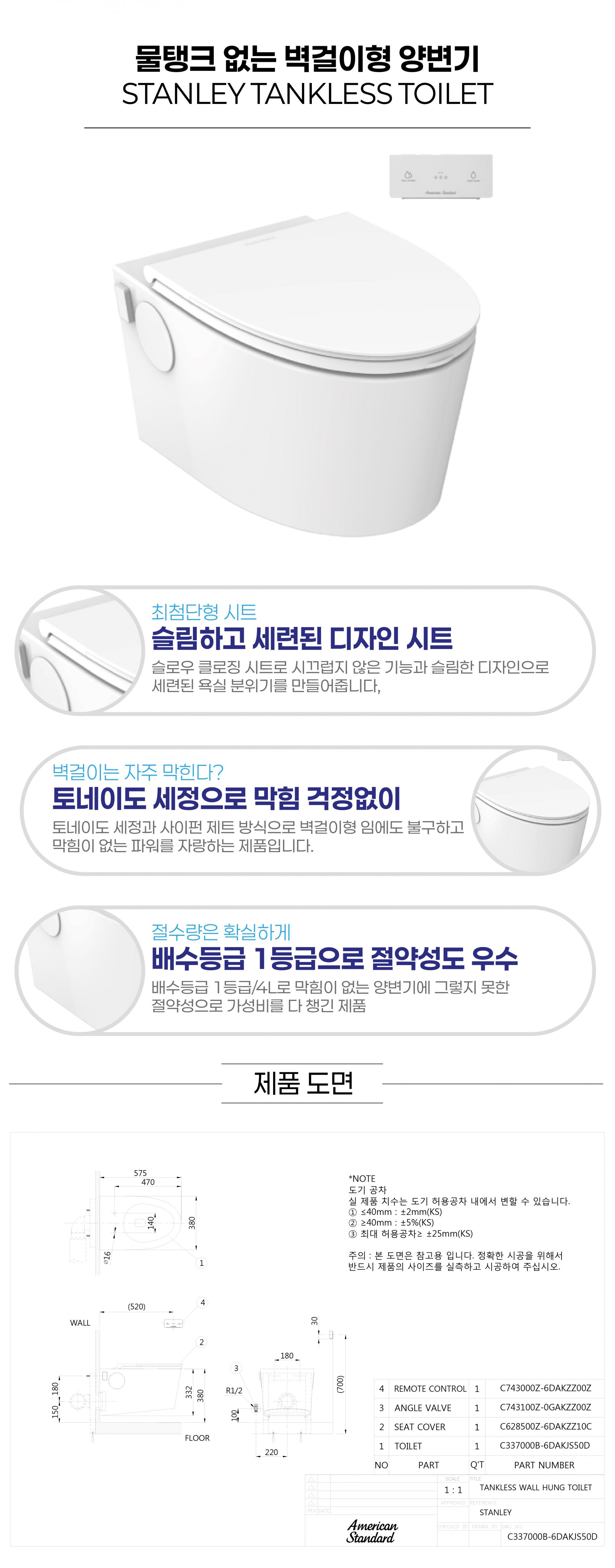 [AMERICAN STANDARD] STANLEY TANKLESS 벽걸이 양변기 (부속별도)