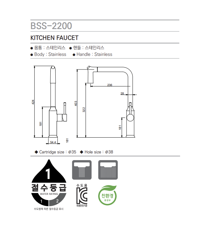 [BELLSCHATZ] BSS-2200 (SS) 주방수전