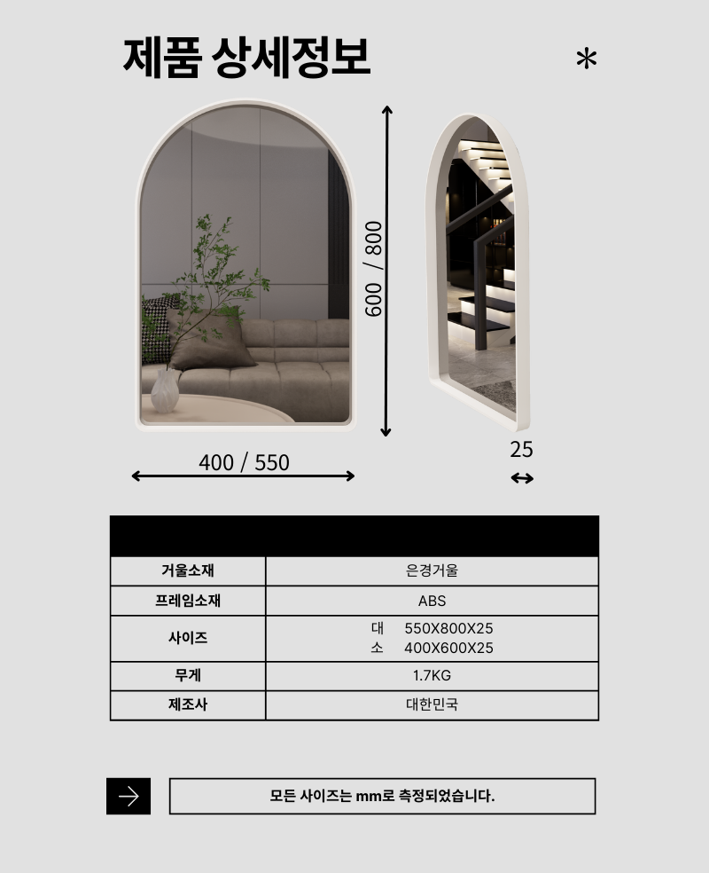 [세진바스] 미니 하프 라운드 거울 450X600