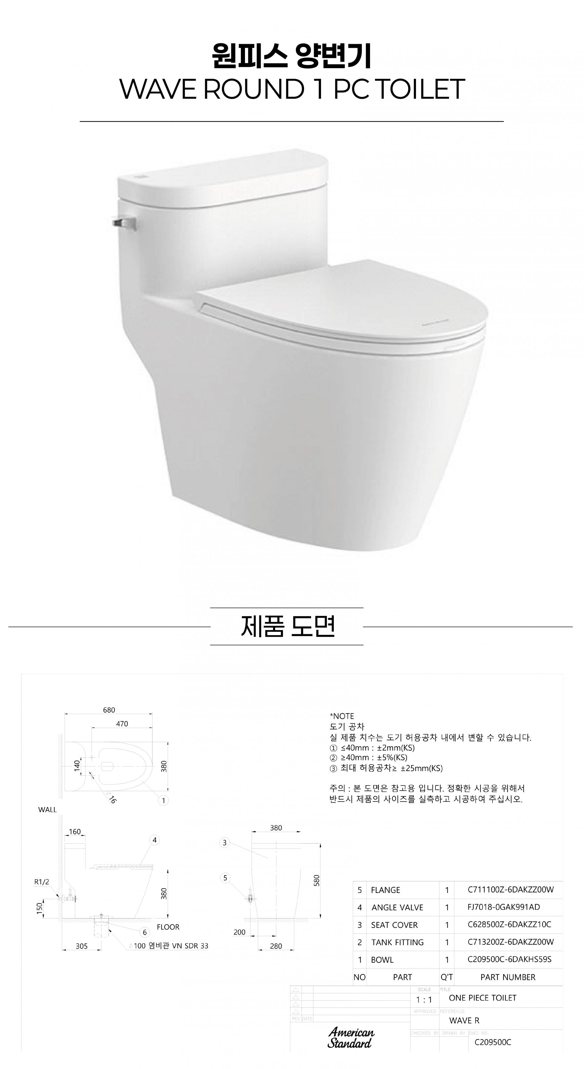 [AMERICAN STANDARD] WAVE R 1PC 웨이브 R 원피스 양변기 (부속별도)